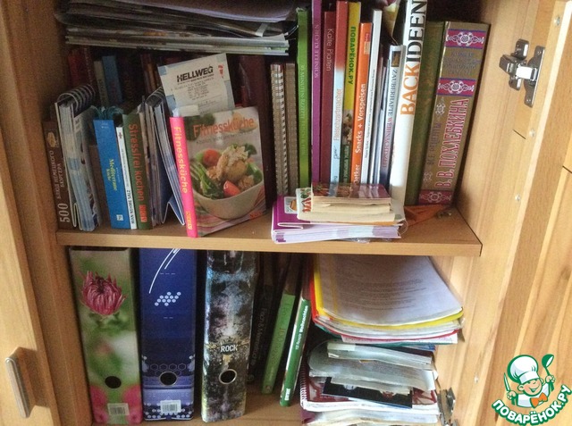 Конечно, теперь у меня достаточно готовых кулинарных книжек - на русском, больше на немецком. Три большие папки с рецептами с Поваренка...но и мои старые самодельные кулинарные тетради-книги стоят тут же, и довольно часто используются