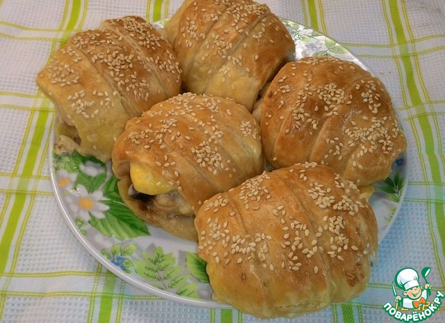 "Слоеный рулет-косичка с колбасой" автор - aleksandra kapyhs. Оставался у меня кусочек слоеного теста от предыдущего рецепта, и я решила сделать на пробу такой вот рулетик, заодно и попробовать плести косичку из теста. Пожалела я потом только об одном-уж больно теста было мало, рулетик совсем небольшой получился! Оченнь вкусно! В следующий раз буду делать полную порцию!