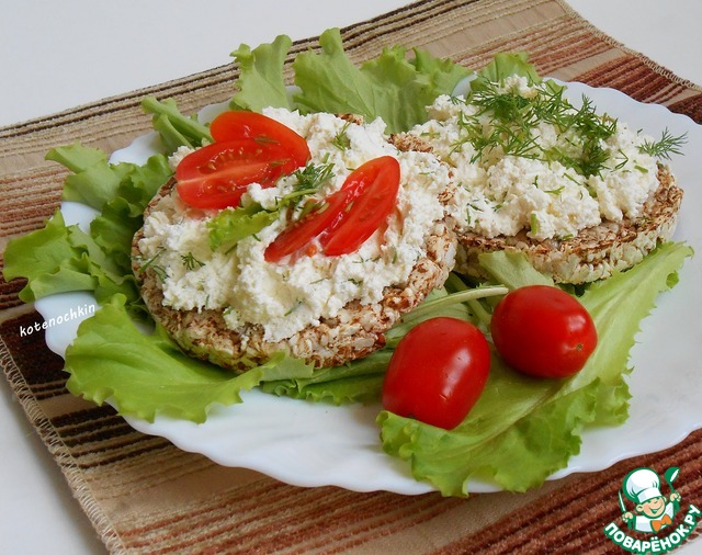 Отличная идея! Часто ем хлебцы, творог люблю, но такой бутер в голову даже не приходил. В качестве украшения вместо сыра у меня укроп и помидорка.