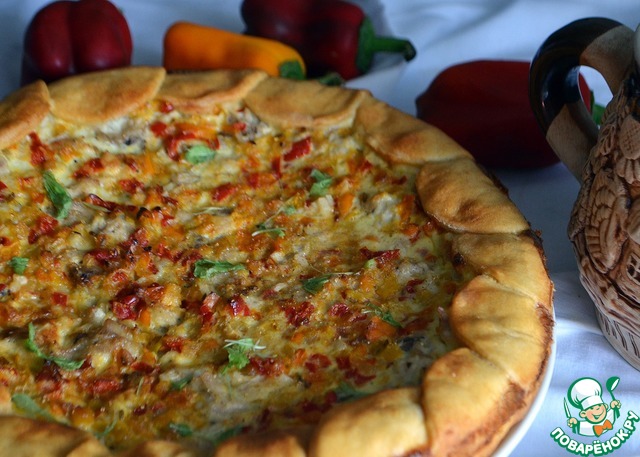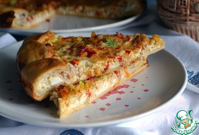 А это киш с курицей, сыром и болгарским перцем. Мне очень понравилась формовка у Светланы (avani), у нее это был пирог грушево-яблочный "Нежность",я ее позаимствовала, за что очень благодарна.
