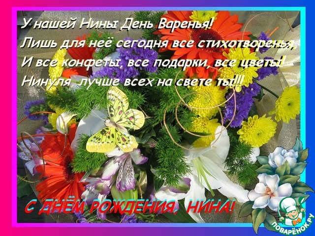 Ниночка, с Днем Рождения тебя, дорогая, здоровья тебе, удачи во всем и новых вкусных рецептов!!!