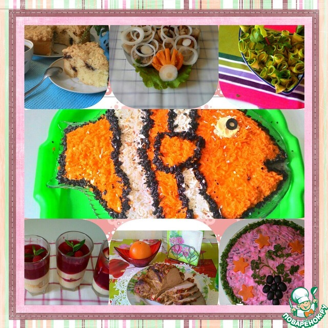 Фурор произвел рыбный салат "Немо". Очень эффектное оформление(канеш, повозиться пришлось!), и салатик очень приятный на вкус! Для оформления использовала отварную морковь, тк желтки у меня были совсем не яркие в отварных яйцах.
