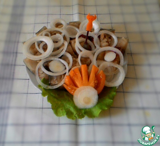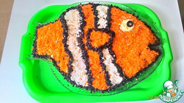 Фурор произвел рыбный салат "Немо". Очень эффектное оформление(канеш, повозиться пришлось!), и салатик очень приятный на вкус! Для оформления использовала отварную морковь, тк желтки у меня были совсем не яркие в отварных яйцах.