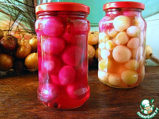 Специально ради этого рецепта посеяла семена лука . Но , видно слишком хорошо за ним ухаживала -выросли довольно большие головки, но на 5 баночек малышей набралось. Очень красивый красный лучок, маринад окрасился в нежный цвет.