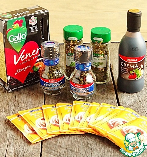 В коробке – черный рис, травы – базилик и розмарин, смесь перцев и зеленый перец, целая упаковка разрыхлителя, и…бальзамический уксус!