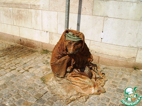 Этот маленький монумент в старой части города не сразу и найдёшь. Но он очень любим туристами. Это бронзовая лисичка-попрошайка. Под плащом у нее сидит лисенок. А у ног стоит медный башмак, в который туристы охотно кидают монетки "на счастье".