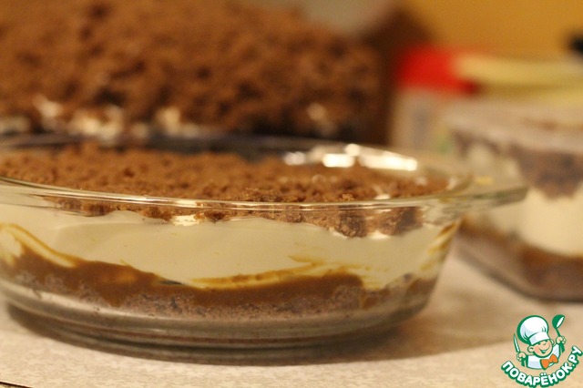 Когда закончила приготовление торта, у меня остался 1 банан, пол банки вареной сгущенки, сливки и мякиш, то есть все то, чтобы сделать для себя десерт. Таким образом, я крошку бисквита положила на дно чаши, немного утрамбовав, затем промазала сгущенкой вареной, положила кружочками бананы, залила сливками и посыпала крошками бисквита. Чем вам не полноценный торт? Прилагаю фото