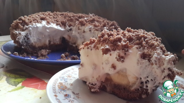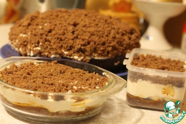 Когда закончила приготовление торта, у меня остался 1 банан, пол банки вареной сгущенки, сливки и мякиш, то есть все то, чтобы сделать для себя десерт. Таким образом, я крошку бисквита положила на дно чаши, немного утрамбовав, затем промазала сгущенкой вареной, положила кружочками бананы, залила сливками и посыпала крошками бисквита. Чем вам не полноценный торт? Прилагаю фото