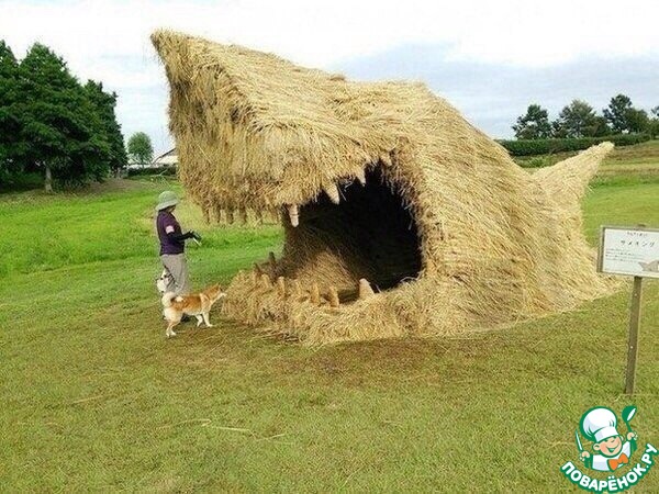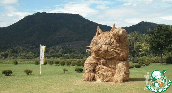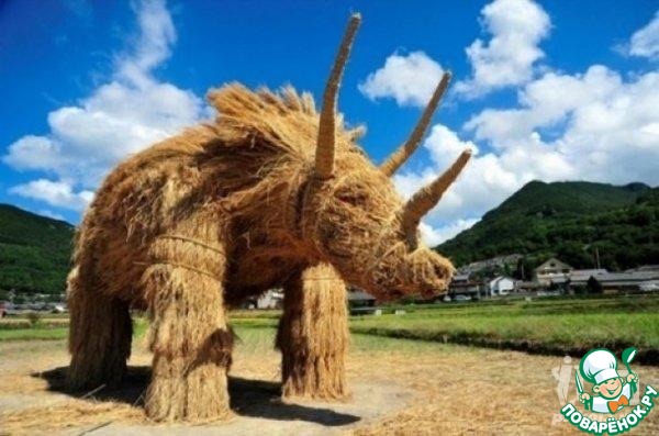 [cut] Оказывается В Японии каждый год, после сбора урожая проводится фестиваль соломенных скульптур, который привлекает туристов и местных жителей своей необычностью. Фигуры создаются на полях, так как остается много сена. Для начала изготавливают каркас, который заполняют соломой, а затем склеивают. Этот материал хорошо гнется и режется. Скульптуры сохраняют декоративный вид долгое время, постепенно начиная темнеть.