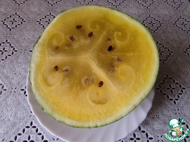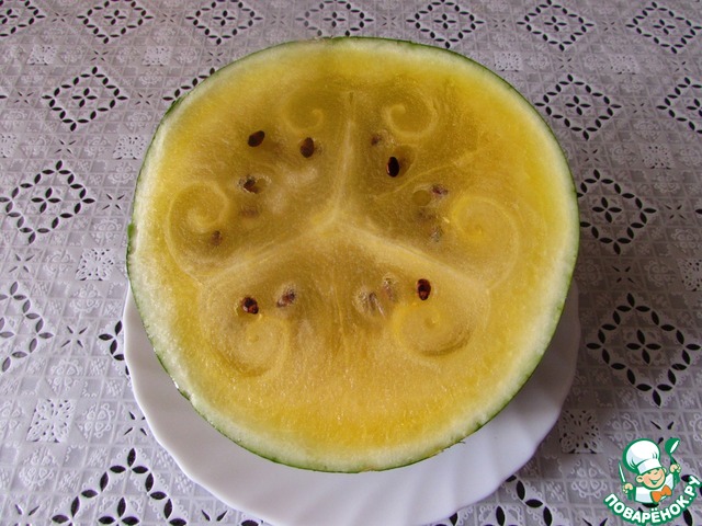 .По вкусу...,нет,по структуре- напоминает обычный арбуз,но со вкусом дыни и лимона.В нём,практически,нет косточек.Очень ароматный,и с долгим приятным послевкусием!!!Вот он - ярко-жёлтый красавец !