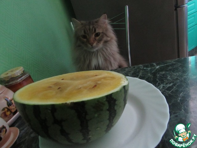 И даже наш кот,любитель красных обычных арбузов, тоже заинтересовался им