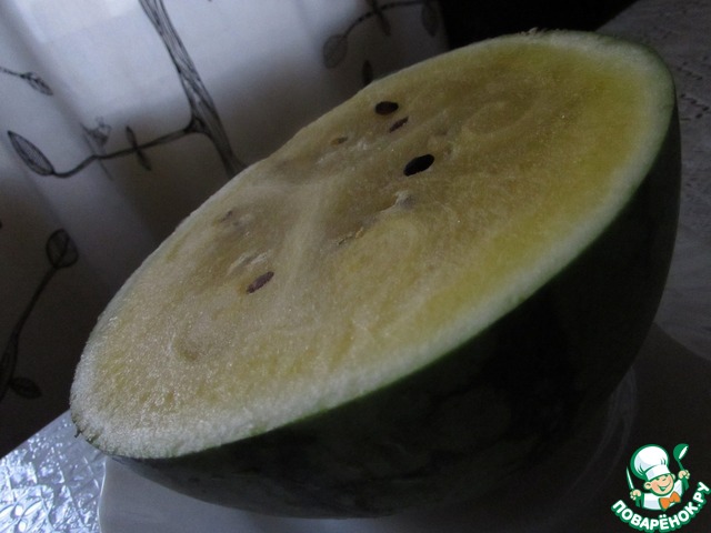 .По вкусу...,нет,по структуре- напоминает обычный арбуз,но со вкусом дыни и лимона.В нём,практически,нет косточек.Очень ароматный,и с долгим приятным послевкусием!!!Вот он - ярко-жёлтый красавец !