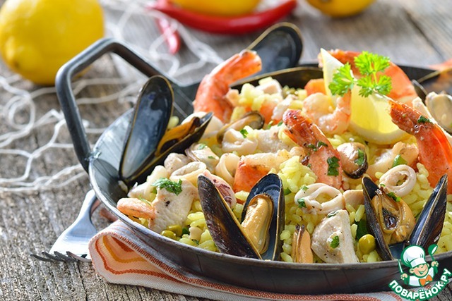 Паэлья происходит от валенсийского «paella», означающего «сковорода». Блюдо готовится из риса, подкрашенного шафраном, с добавлением оливкового масла. Классическая паэлья, помимо риса, включает в себя 6—7 видов рыбы и морепродуктов, курицу, белое вино, зелень и специи.