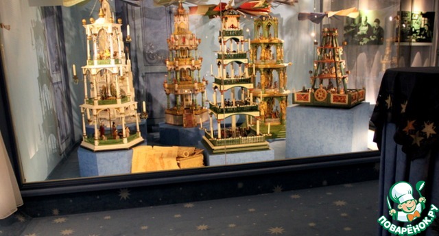 В музее (очень маленькая экспозиция) - небольшая коллекция старинных игрушек, елок, Николаусов, подставок под елки и вертушек-пирамидок
