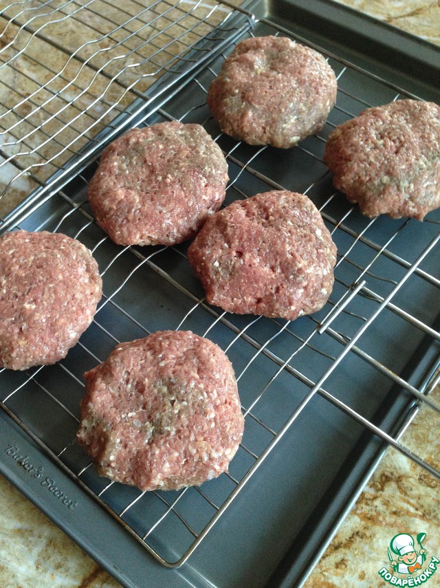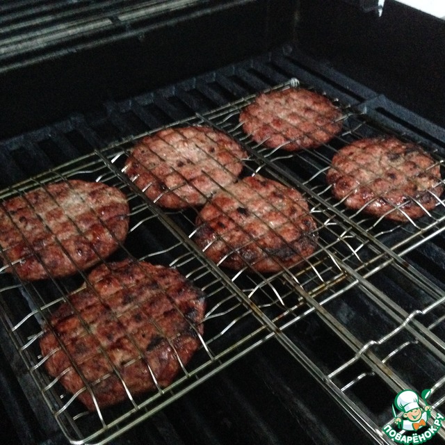 ). Сформировала большие плоские бургеры, положила их на решетку. При этом еще подумала, что могут прилипнуть к решетке, посему решетку хорошенько смазала растительным маслом.