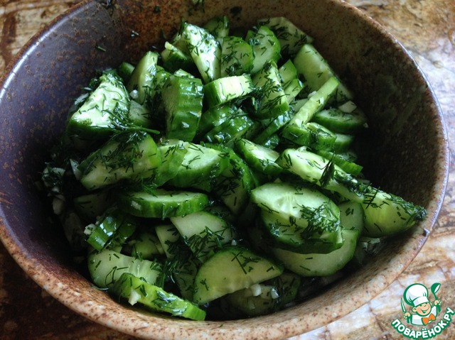 Пока нагревался гриль быстренько сварганила пару салатиков. Один: свежие огурцы+чеснок+зеленый укроп+растительное масло (я этот салат делаю с душистым подсолнечным маслом, мне кажется, что это хорошее сочетание)+соль. Второй: в холодильнике оказалась баночка квашенной капусты - любимый муж купил в русском магазине - промыла ее, порезала красный лук, заправила тем же душистым (пишу душистым, потому как у нас есть рафинированное подсолнечное, я на нем жарю, если приходится жарить, оно не пахнет практически ничем, а есть нерафинированное, оно имеет очень характерный запах - не все любят, а мне кажется, что в некоторых блюдах это масло просто незаменимо - в винегрете к примеру) подсолнечным маслом.