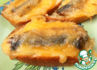 (На багет майонез+чеснок, сверху выкладываем шпротинку, посыпаем сыром и в духовку. Вкуснотища!)