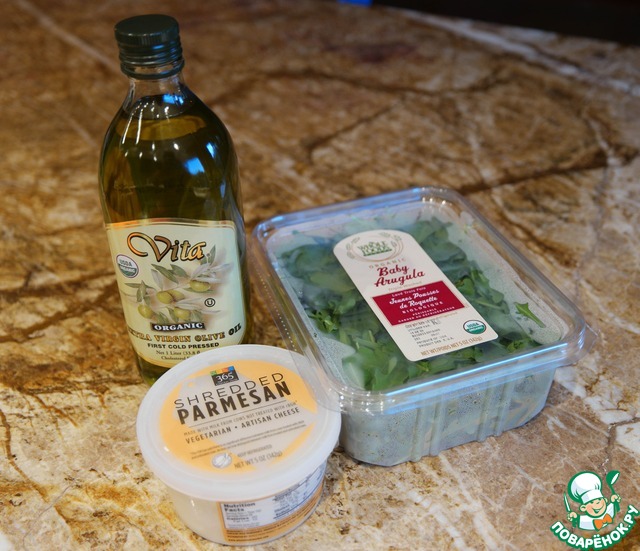Все что нужно - арагула, пармезан (наверное можно заменить каким-нибудь другим "выдержанным" сыром, не знаю не пробовала) и оливковое масло.