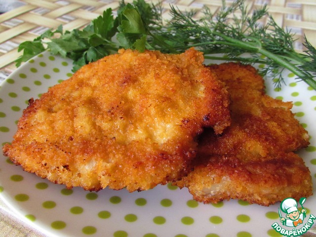 Венский шницель по рецепту Puziks https://www.povarenok.ru/recipes/show/86423/#dopphotos -Шницели очень понравились!Нежный,сочные,с хрустящей корочкой!До этого готовила отбивные,используя такую же панировку -мука и сухари ,а вот обмакивала их просто во взбитом яйце.Поэтому вариант яйца с молоком очень заинтересовал.Результат очень порадовал!Буду готовить по такому рецепту и в дальнейшем!