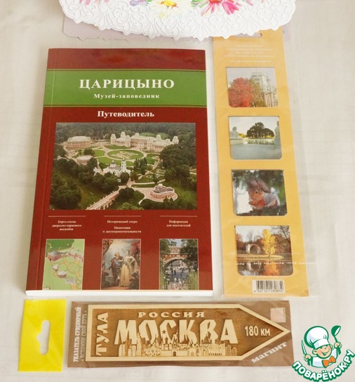 Иришка, помня, что когда мы с ней и Женечкой были в Царицино, мне не удалось купить сувениры и вот моя заботливая подружка подарила мне красивый и подробный путеводитель, магнитные закладочки с видами Царицино и чудесный магнит, что бы я не забывала дорогу до неё