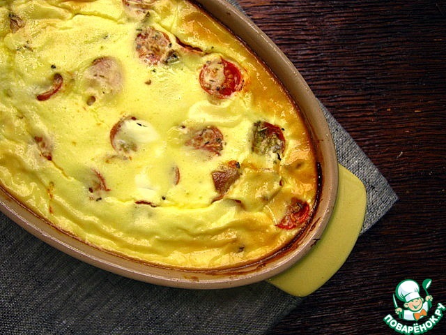 Ароматно, нежно, сытно ! все, как написано в презентации рецепта - и пикантность запеченного чеснока, и кислинка черри, и сливочный вкус сыра. В следущий раз чуть уменьшу количество заливки, многовато ее оказалось, все помидорки спрятала.