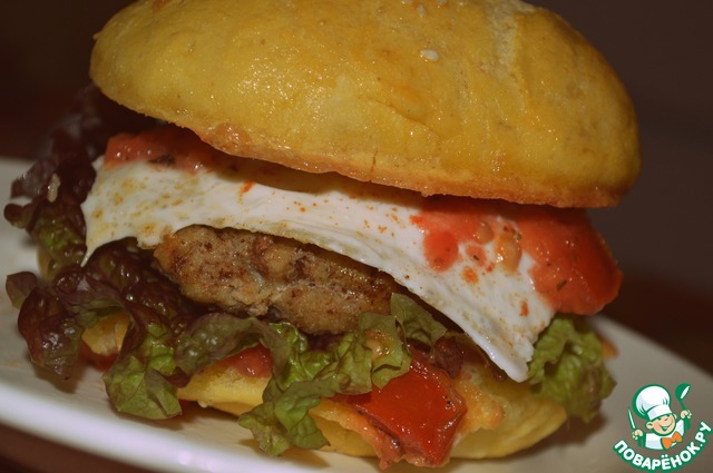 К тому же, для меня в итоге вышел бонус. Фарша я взяла 400 грамм вместо положенных 200, потому он у меня остался. И, налепив котлетки, я решила сделать гамбургеры! Наляпав булочки с кунжутом (что оказалось тоже просто и любопытно), пропитала их томатами, потушенными на сковороде с итальянскими травами. Положила лист салата, котлетку из замечательного фарша, яичницу глазунью, а сверху снова пропитала булочку.