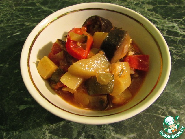 "Мясо, запечённое с овощами под "шапкой"" по рецепту Смирнов Роман-RomaXa https://www.povarenok.ru/recipes/show/112039/ - В таком варианте овощей раньше не готовила,ещё и сладкого перца добавила-понравилось очень!