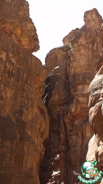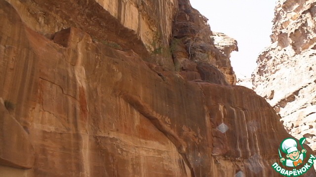 Дорога в скальный город Петра начинается с узкого ущелья, вдоль которого с двух сторон возвышаются на сотни метров скалы.Движение происходит в темноте,солнце не может попасть сюда.Дальше постепенно начинает светлеть,и становятся заметными вырубленные в скале ниши для статуй.