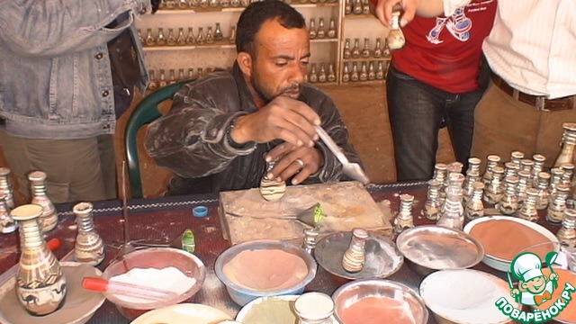 Вот такие по пути встречаются мастера, которые сделают из песка бутылочки с разными рисунками