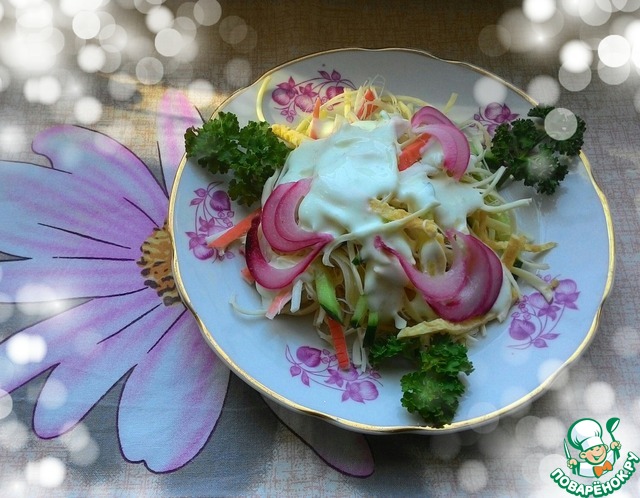 Аппетит маринованными кабачками разогрели, переходим к салату! Салат "Женский" с сыром сулугуни от Натулечки (LNataly). Салатик очень понравился! Меня только немного подвел сулугуни-оказался солоноватым, пришлось уменьшать его количество в салате.