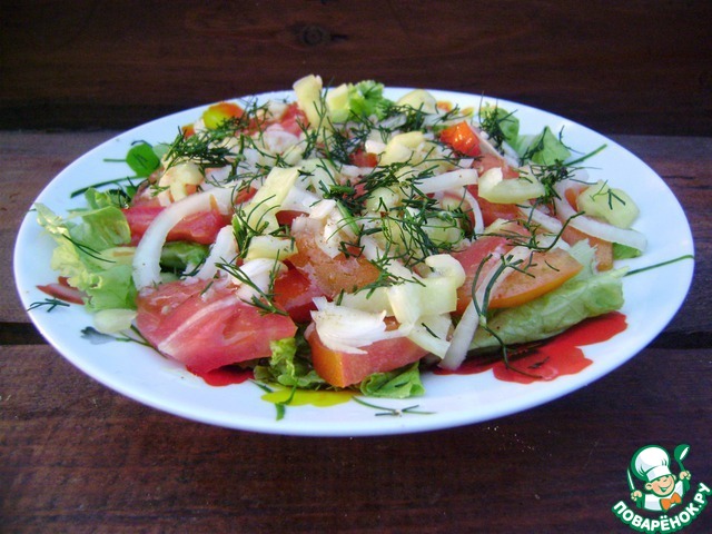 Вкусный и свежий салатик. Сплошные витамины. Кинзу не люблю, вместо нее взяла укроп.