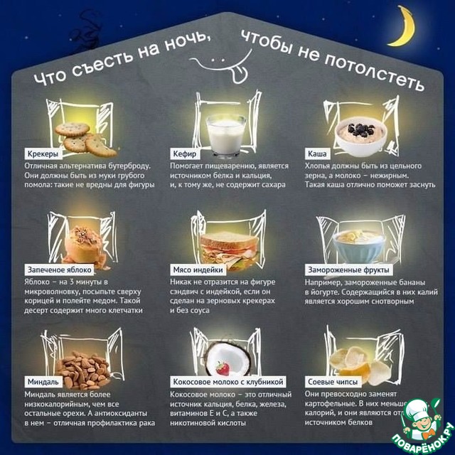 Ничего себе:фрукты и запеченное яблоко понятно,но каша,крекеры и миндаль на ночь?Вот интересно-то.