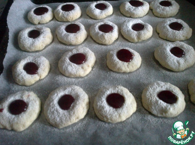 Хоть и не такое красивое как у автора рецепта, но очень вкусное печенье с конфитюром https://www.povarenok.ru/recipes/show/70829/. Для начинки перетерла домашнее смородиновое варенье. Боялась передержать, поэтому печеньки бледные.
