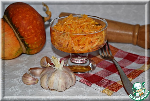 Ну какая же вкуснейшая тыква!Остренькая,пикантная,ароматная.Очень яркая и оригинальная закуска!Оля рекомендовала,чтоб тыква настоялась какое-то время.Честно скажу,час салат не стоял...Не успел...