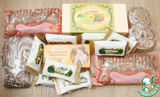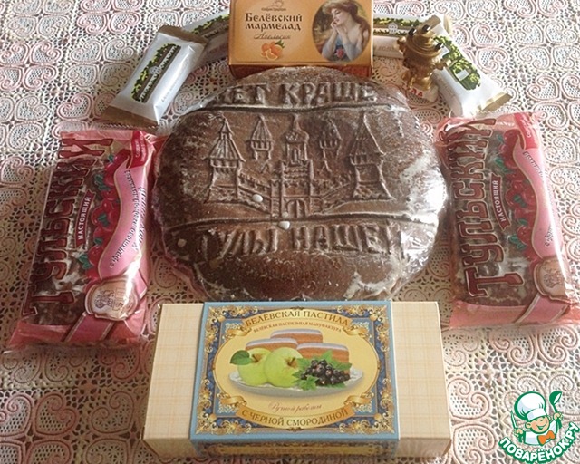Огромный,сувенирный и такие ароматные с клюквенной начинкой Тульские пряники,Белевская пастила с черной смородиной,Белевский апельсиновый мармелад,нежнейшие конфеты-суфле "Ясная поляна",и магнит-сувенир в виде Тульского самовара.