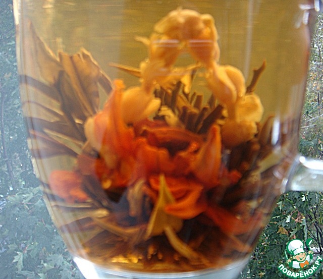 Первый - Шуан Лун Си Чжу (Два Дракона играют с жемчужиной).Очень красивая композиция: две гирлянды из жасмина – символизируют драконов, охраняющих жемчужину (соцветие астрагала). Считается, что это символ благополучия в семейных отношениях между супругами. Прозрачно-янтарный настой этого чая несёт в себе противовоспалительные и антистрессовые свойства. Кроме того, он очень приятен на вкус.