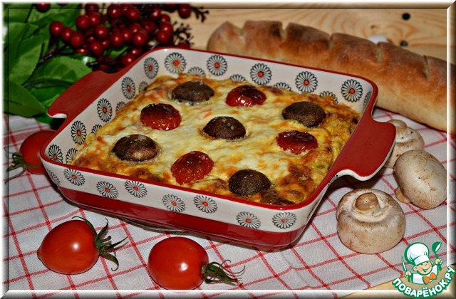 Сочно,нежно,ароматно и ооооочень вкусно!Идеальное сочетание рыбы и овощей.Прекрасная сырно-сметанная заливка.А грибы и помидорчики-черри придают этому блюду особый вкусовой колорит.