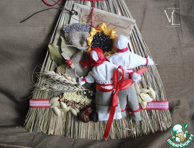Всем привет) Меня так и тянет на красную гамму на кухне. Давно хотела сделать веник - оберег. Меня не устраивали его покупные аналоги. Перечитала много информации в интернете в итоге пришла именно к этому варианту. Использовала на нем 12 символов. Сделала 2 мини - куклы мотанки, тоже по всем правилам: мужская и женская фигурки, перевязанные вместе - для мира и любви между супругами. Шиповник - женское здоровье, денежка - к богатству и т.д. [cut]