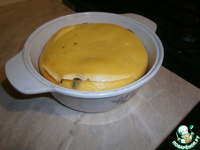 Очень нежная и вкусная. Я муку заменила манкой, а сахар - медом. Добавила изюм. По структуре больше похожа на суфле, поэтому при нарезании немного распалась. Хотя на следующий день резалась замечательно.