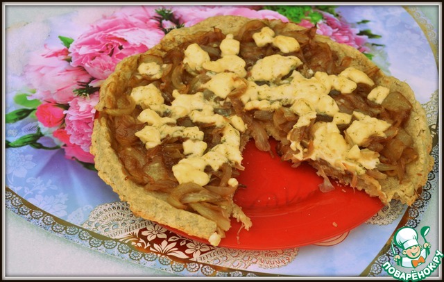 Сразу говорю, делала его под свои продукты. Но, так как, именно из-за Наташи влюбилась в карамелизированный лук, не могла не сделать подобную выпечку. Однако тесто у меня совсем другое, овсяное, оно, кстати, приятно хрустящее. Вместо твёрдого сыра – плавленый, растопленный на сковороде, и смешанный с кефиром и специями: такая вот ароматная вышла заливочка. Мне получившийся пирог очень понравился! А какой он ароматный, какой необычный на вкус!