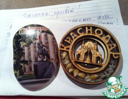 Договаривались мы с ней, что она пришлет мне магнитик с изображением ее города, так как эта хитрушка очень хотела, чтоб я прислала ей черевы, но не давала свой адрес, пока я не напишу ей свой!!! Просто шантажистка)))) В результате получила я не магнитик, а два магнитика))) и «небольшое» приложение к ним (как Маша написала))))))))))))))