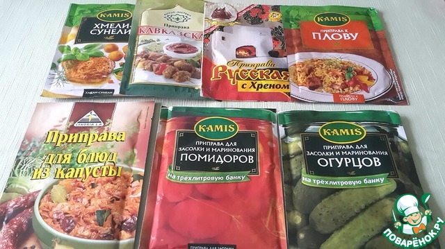 И наконец - для души. Смотрю я на эти пачки с приправами и медитирую :"И это все мое???" Тут и кавказская приправа, и хмели-сунели, и русская приправа с хреном, и приправа для капусты. И вожделенные пакетики со смесью для маринования огурцов и даже помидоров! И приправа для плова - вот у мужа моего праздник будет!