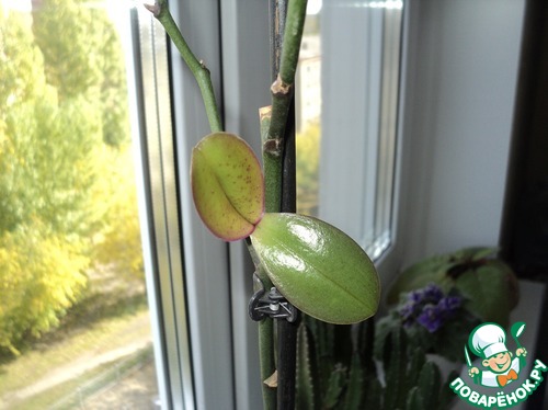На отцветшей стрелке появились такие листочки. Орхидея решила произвести себе подобную! Потом эта стрелочка стала засыхать и я аккуратно отделила детку от мамки и "присадила" в тот же горшок.