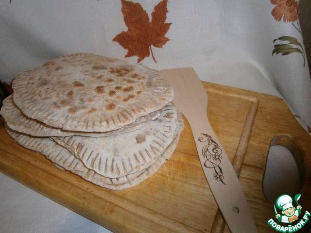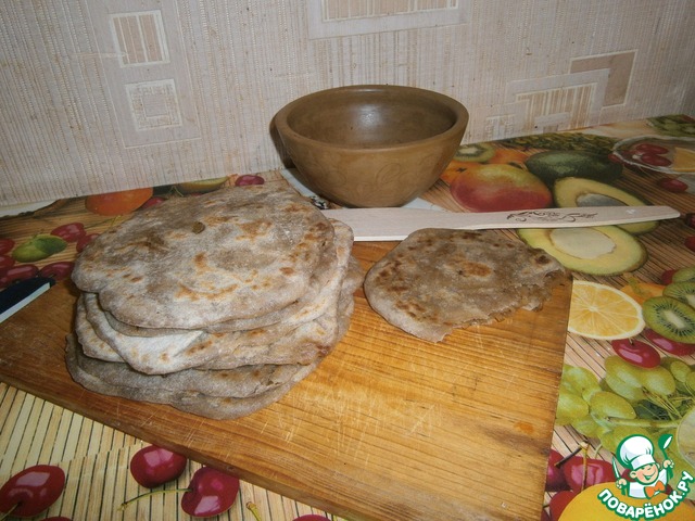 Делала с добавлением ржаной муки. В начинку положила домашнюю аджику. Жарила на сухой сковороде. Начинка очень вкусная, может быть гарниром.