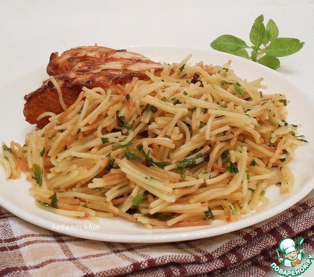 Просто чудесный гарнир! Хотела четко соблюсти пропорции, а сын так веселился, глядя, как я взвешиваю макароны)))) Из зелени у меня петрушка и базилик, и одновременно добавила 1 раздавленный зубчик чеснока. Аромат потрясающий стоял!