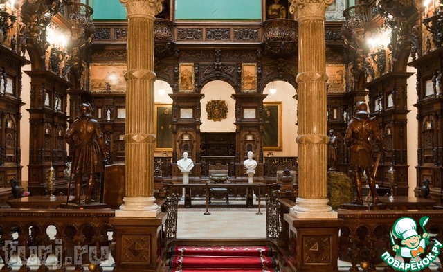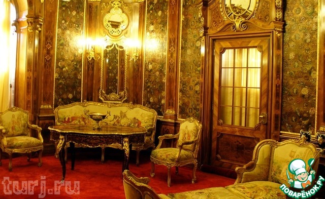 Поистине королевская роскошь характеризует и внутреннее убранство: восточные ковры из Бухары, зеркально отраженные в потолочной росписи, гобелены, майсенский и севрский фарфор, скульптуры и живопись, золотые и серебряные изделия, коллекция оружия и доспехов, в которой более 4 тысяч предметов, швейцарские витражи, расписанные вручную, мебель и изделия из слоновой кости, люстры из муранского стекла и стены, покрытые кожей из Кордовы… К тому же, каждая комната – уникальна. Так, Флорентийская комната декорирована эбонитовым деревом, Турецкая – затянута шелком, а Французская – полностью выполнена в духе Людовика IV.