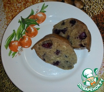 Чернослива и орехов (ну совсем никаких) у меня в хозяйстве не нашлось, зато нашлась замороженная вишня. Возможно также, что я положила слишком много меда, в рецепте указано 2 столовые ложки, мед засахаренный, в двух ложках с горкой его оказалось аж 130 г. Возможно, поэтому муки мой пирожок потребовал больше, 330 г.