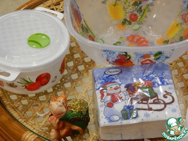 А теперь подробнее. Это контейнер, миска, замечательные новогодние салфеточки и символ наступающего года - обезьянка.