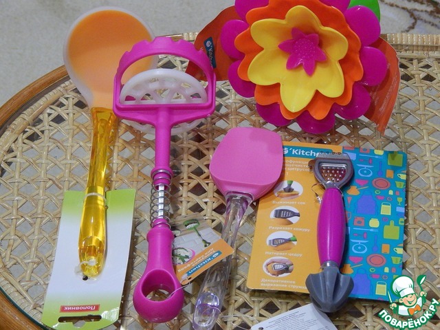 А здесь силиконовый половничек, толкушка для картофеля, лопаточка, набор воронок, удобная очень овощечистка для цитрусовых.