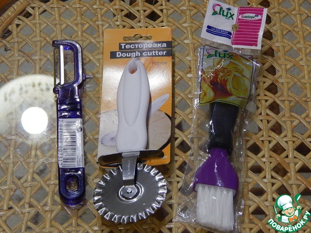 Далее замечательная тесторезка (у меня такой не было, есть с мелким шагом), овощечистка, кулинарная кисть.